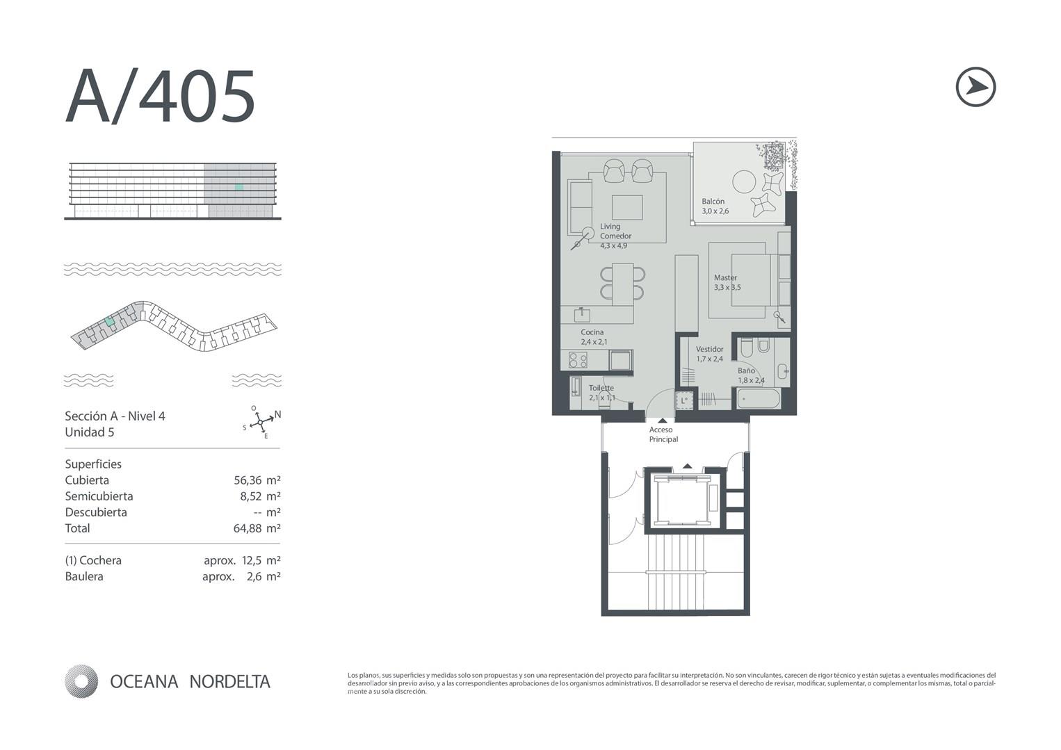 Espectacular departamento de 64,88 metros propios mas cochera mas baulera. Living comedor con cocina integrada. Toilette de recepcion. Suite. Balcon aterrazado Oceana es un desarrollo residencial con un concepto en comun: el agua y el arte. Oceana expresa los standares de calidad de Consultatio: una locacion unica, construccion high-end y criterios de sustentabilidad. Muelle privado y mirador hacia la laguna. Pileta climatizada cubierta. Salas de reuniones independientes en PB Gimnasio con aparatos de ultima generacion. Salon de relax, yoga y spa. COTI en trámite a cargo del propietario. Martillero Publico CMCPSI 6692