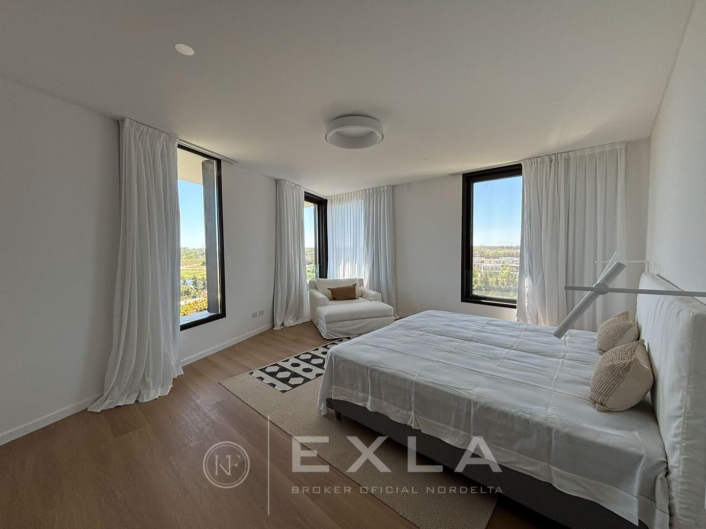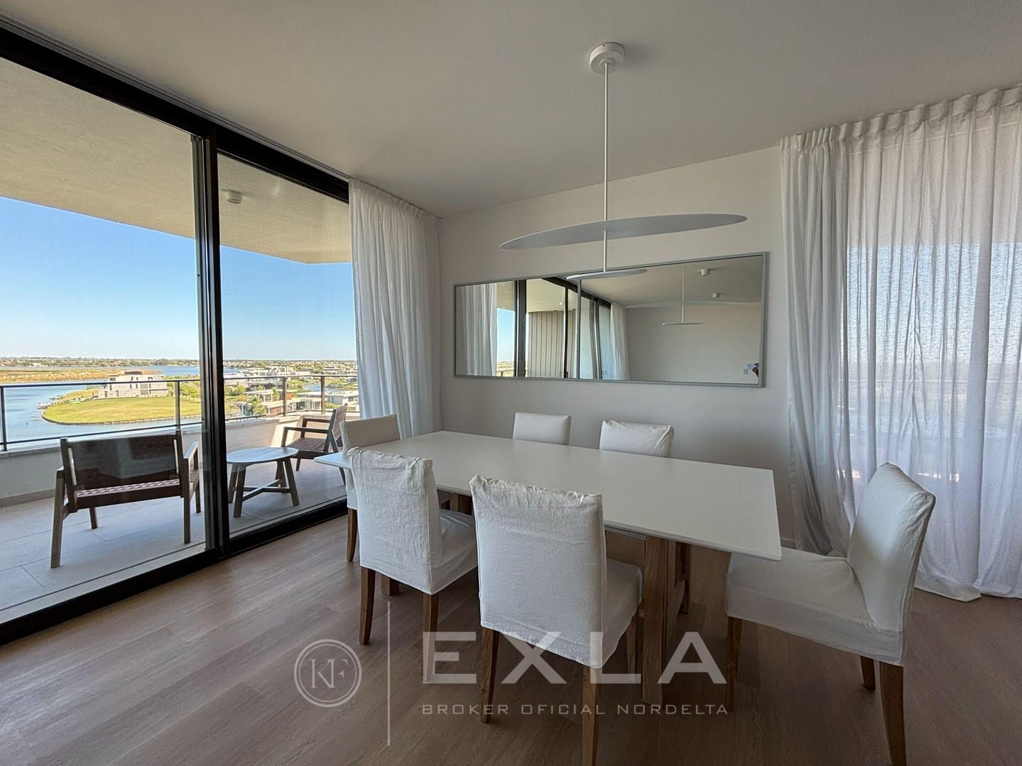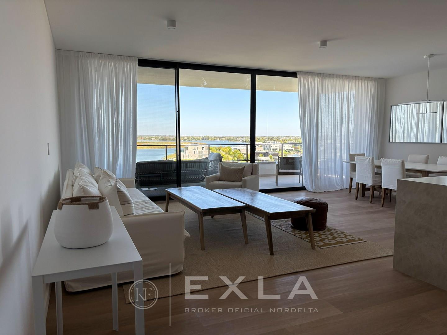 Departamento en alquiler A ESTRENAR amueblado en el mejor complejo de Nordelta - OCEANA NORDELTA - sobre el lago central con vista increible al agua desde todos los ambientes . PISO ALTO. Hall de entrada. Living comedor con cocina integrada con una espectacular vista al lago central. Gran balcon terraza con living exterior y otro balcon comunicado con el balcon terraza donde se encuentra la parrilla y la mesa para comer afuera La cocina esta toda revestida con marmol , equipada con electrodomesticos panelables y cuenta con una gran isla con mucho lugar de guardado. Gran playroom o family con baño completo que podría ser un tercer dormitorio en caso de ser necesario. . Suite junior con su vestidor y baño. El Dormitorio principal con increíble vista, muy amplio cuenta con doble banio, y doble cuarto de vestir. Lavadero, Los pisos son de madera. al igual que los muebles de la cocina y la pared de ingreso. . Calefaccion por losa radiante - Aire acondicionado central, ( . Carpinterias con dvh. El departamento se entrega total mente amoblado cortinas, muebles, heladera , lavaplatos, freezer, maquina de lavar y secarropas. Todo nuevo y disenado especialmente para este lugar. El complejo cuenta con un gimnasio equipado con equipos de primera calidad, vestuarios, dos piletas externas que dan al lago, pileta interna climatizada, lugar de juegos con mesa de pool y sum con mesas y livings. sala de yoga y cuenta tambien con dos coworking., Salon para usos multiples , Los amenities del departamento son fuera de serie, Dos cocheras fijas , y baulera COTI en trámite a cargo del propietario. Martillero Publico CMCPSI 6692